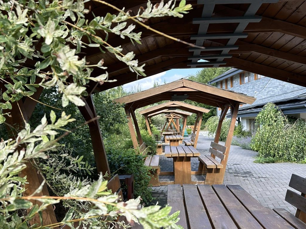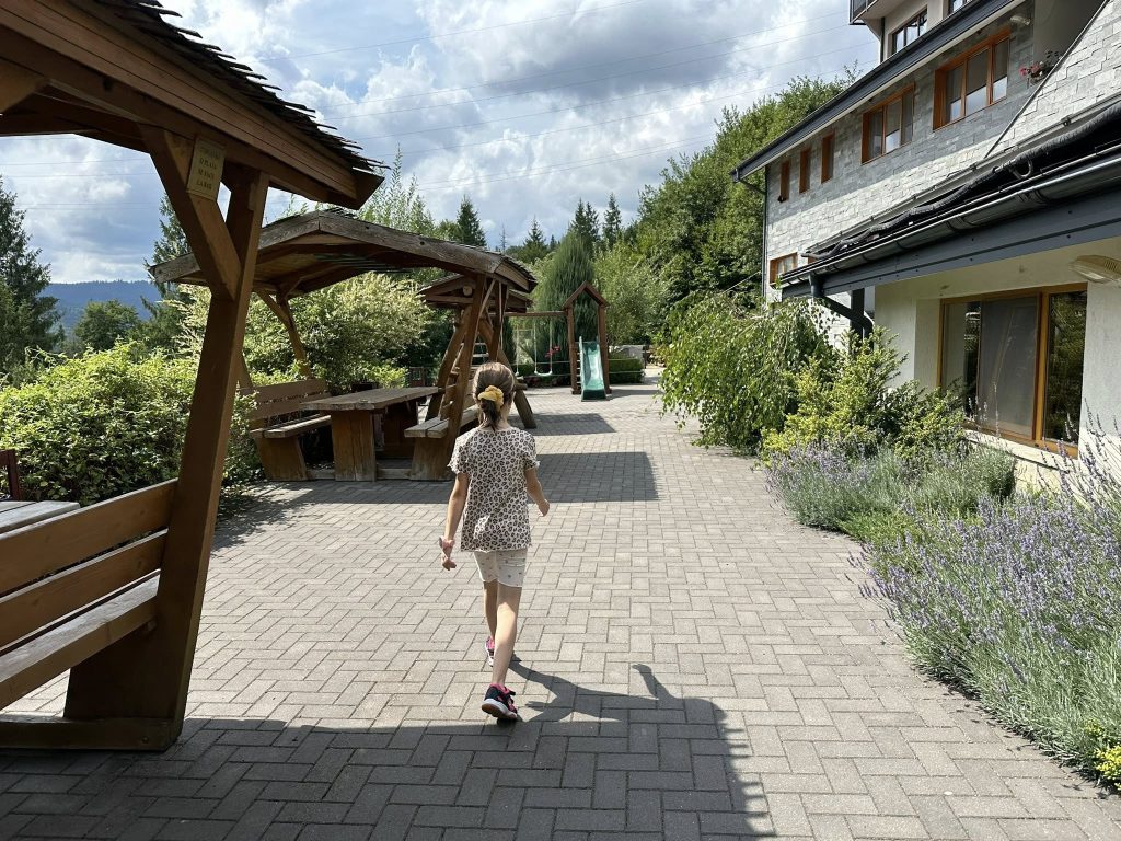 În curte este un foișor și un spațiu unde poți bea o cafea/ suc. Se lasă o donație.